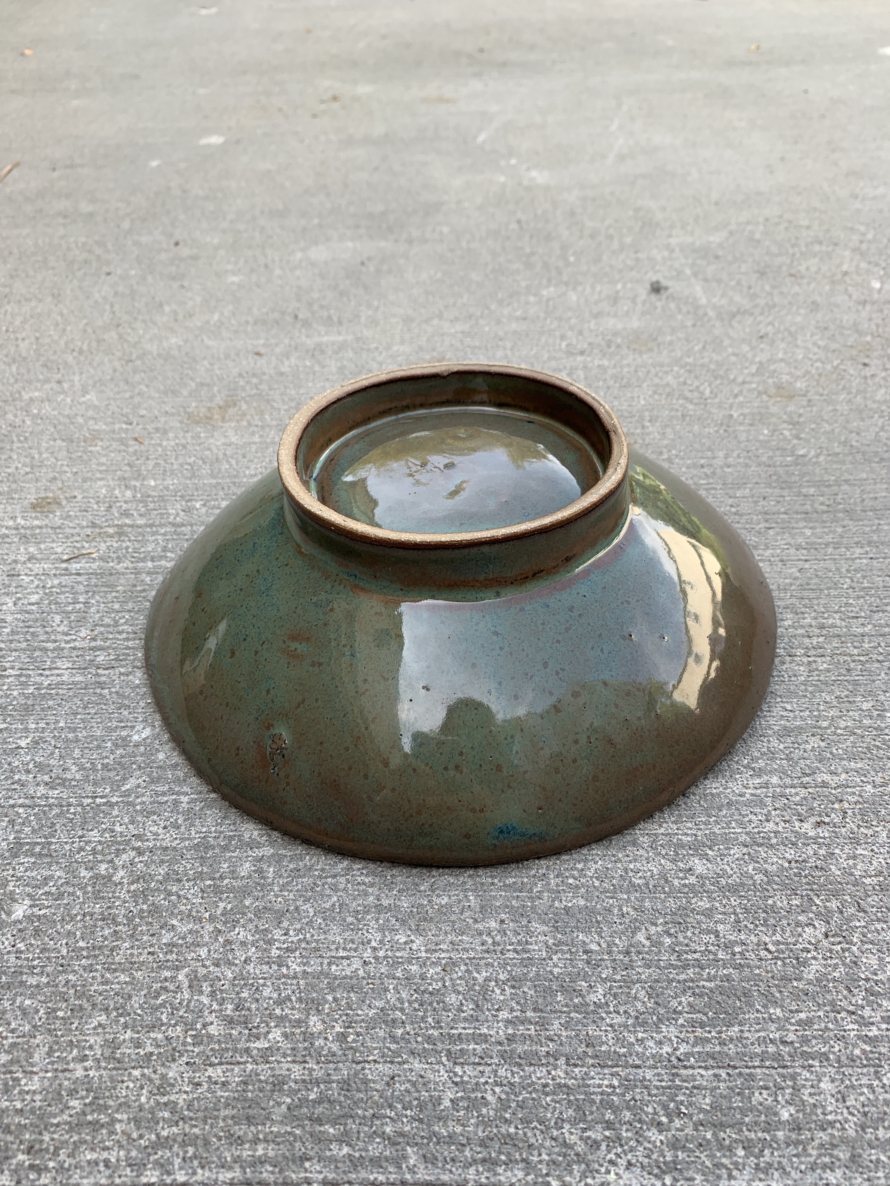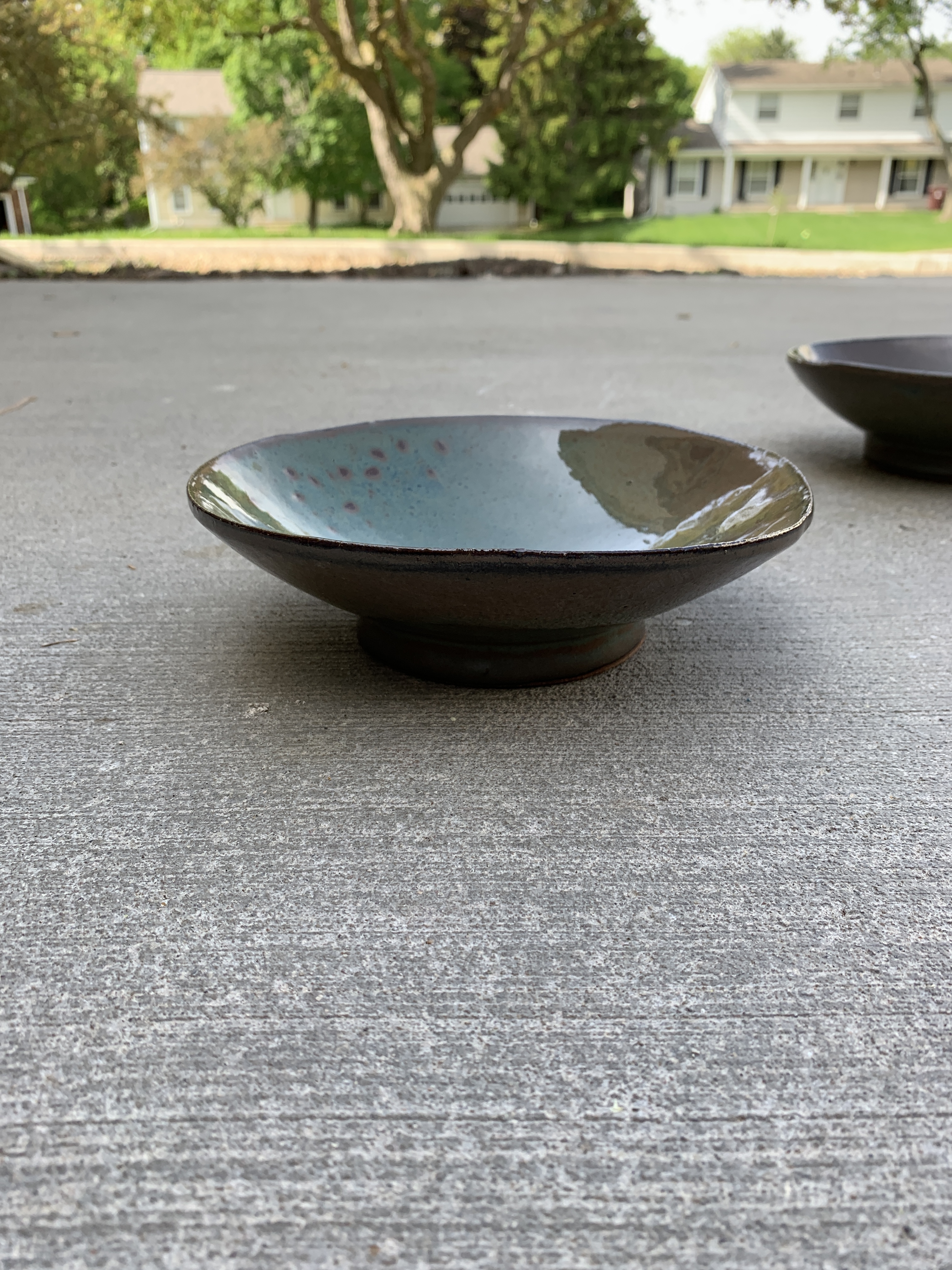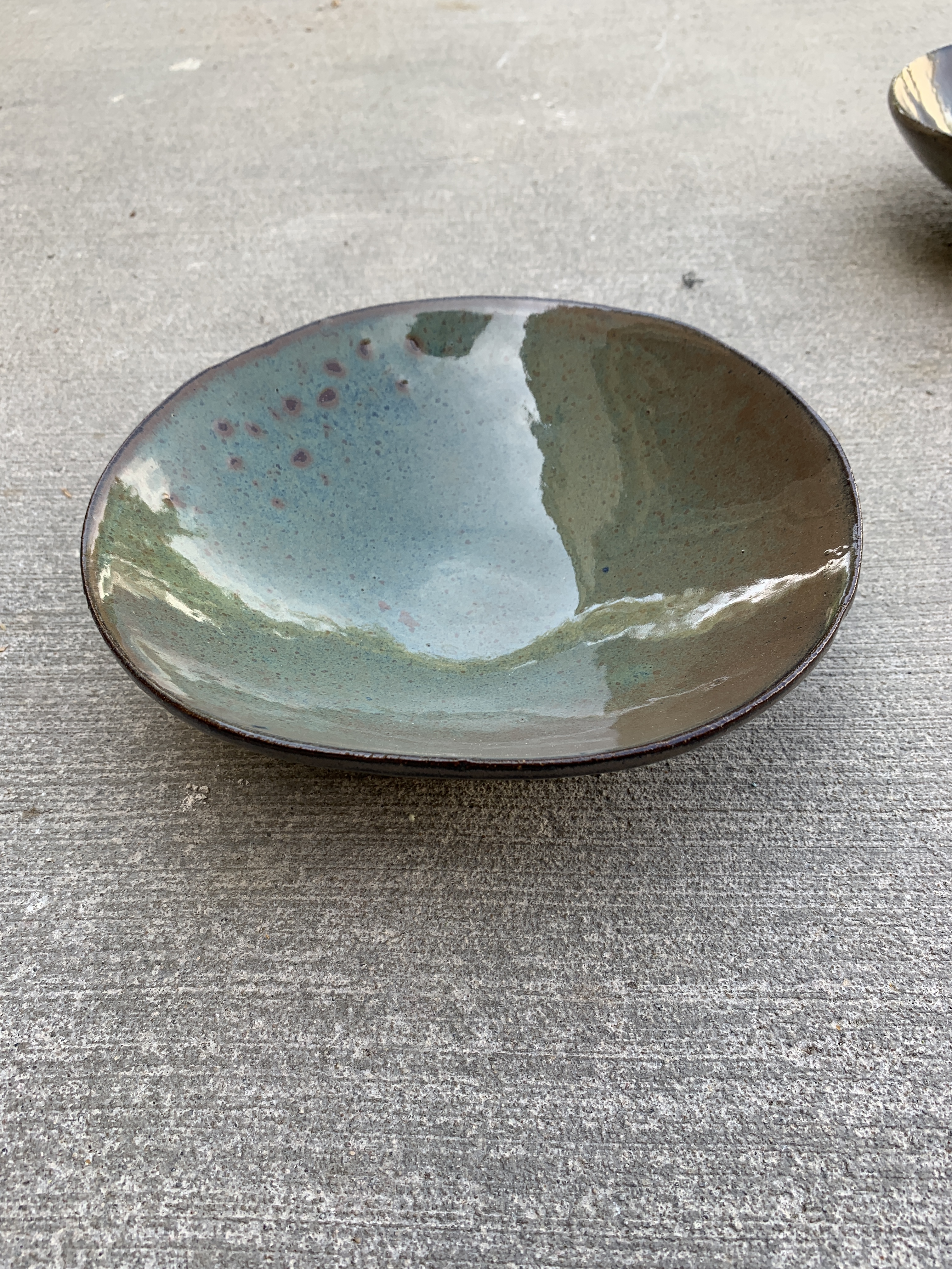 hand built green blue with spot design — (SOLD) 19 cm diameter; 5.5 cm tall; 460 g — SOLD for $20 Related